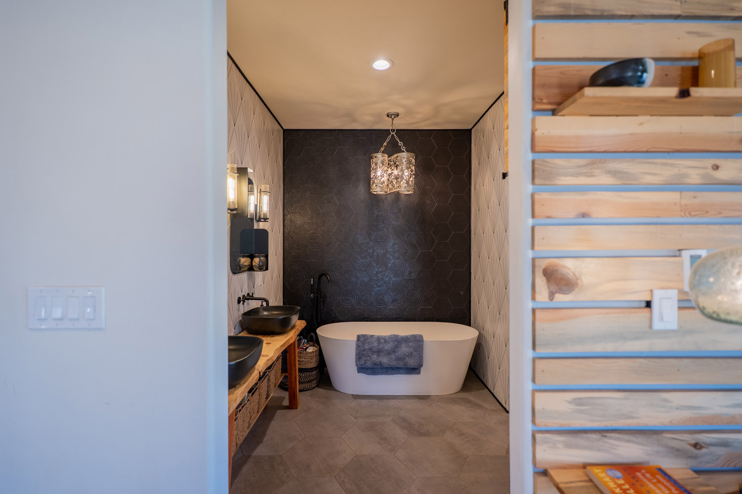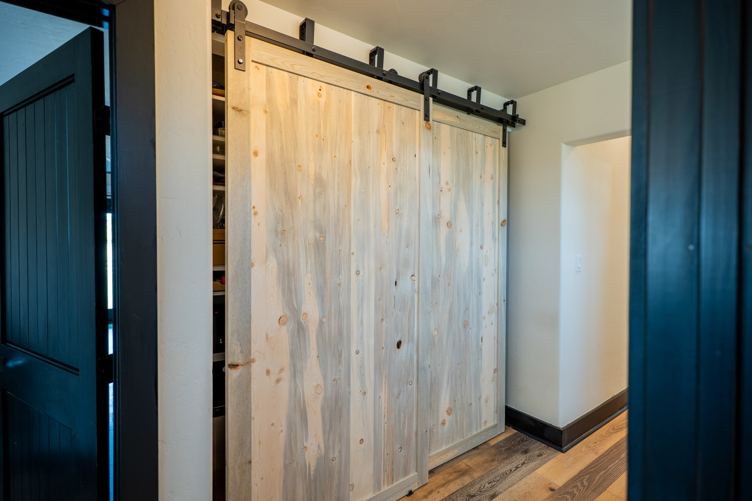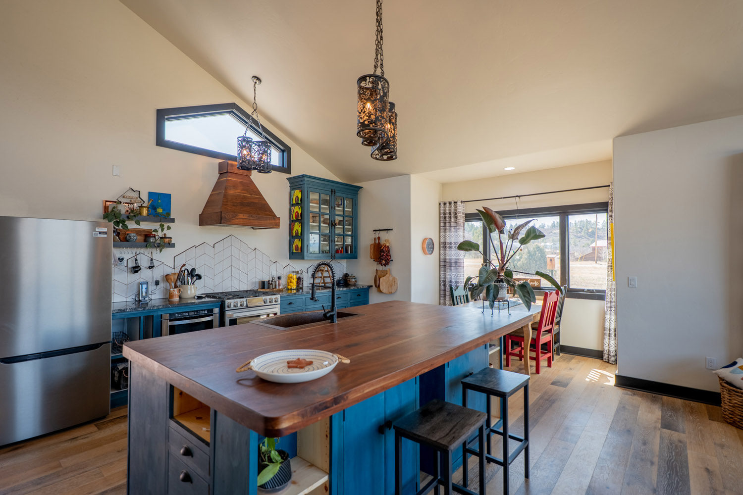 The kitchen is a chefs dream, showcasing a striking 8 foot by 5 foot walnut island, custom apothecary cabinetry, a copper farmhouse sink, a dedicated coffee station, and a large pantry with sliding barn doors. The seamless flow between the kitchen, living, and dining areas makes this home perfect for daily living and entertaining.